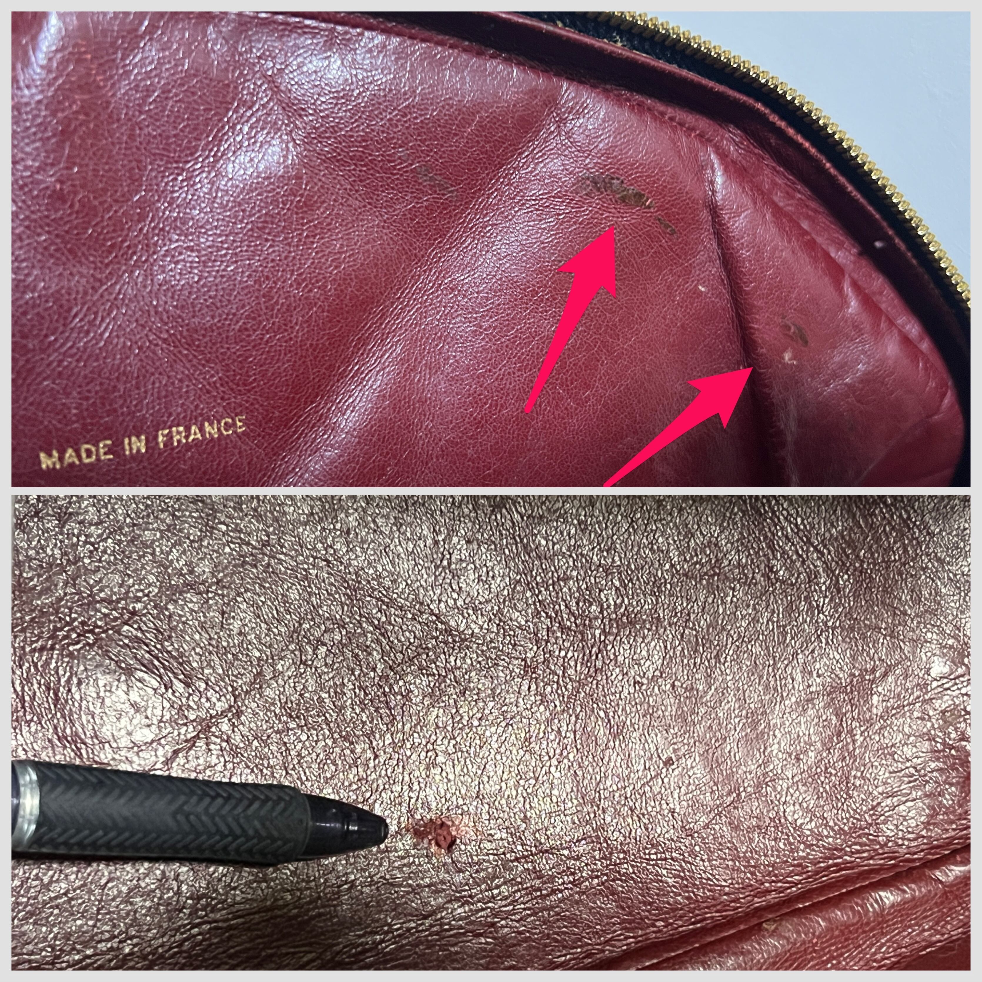 内部は比較的綺麗でしたので何も手を加えずオリジナルの状態です。底面中央に小さな擦れ、口周りに若干擦れや汚れあり※画像8参照 レザーの匂いは多少しますがカビやほこり、香水等嫌な臭いはありません。