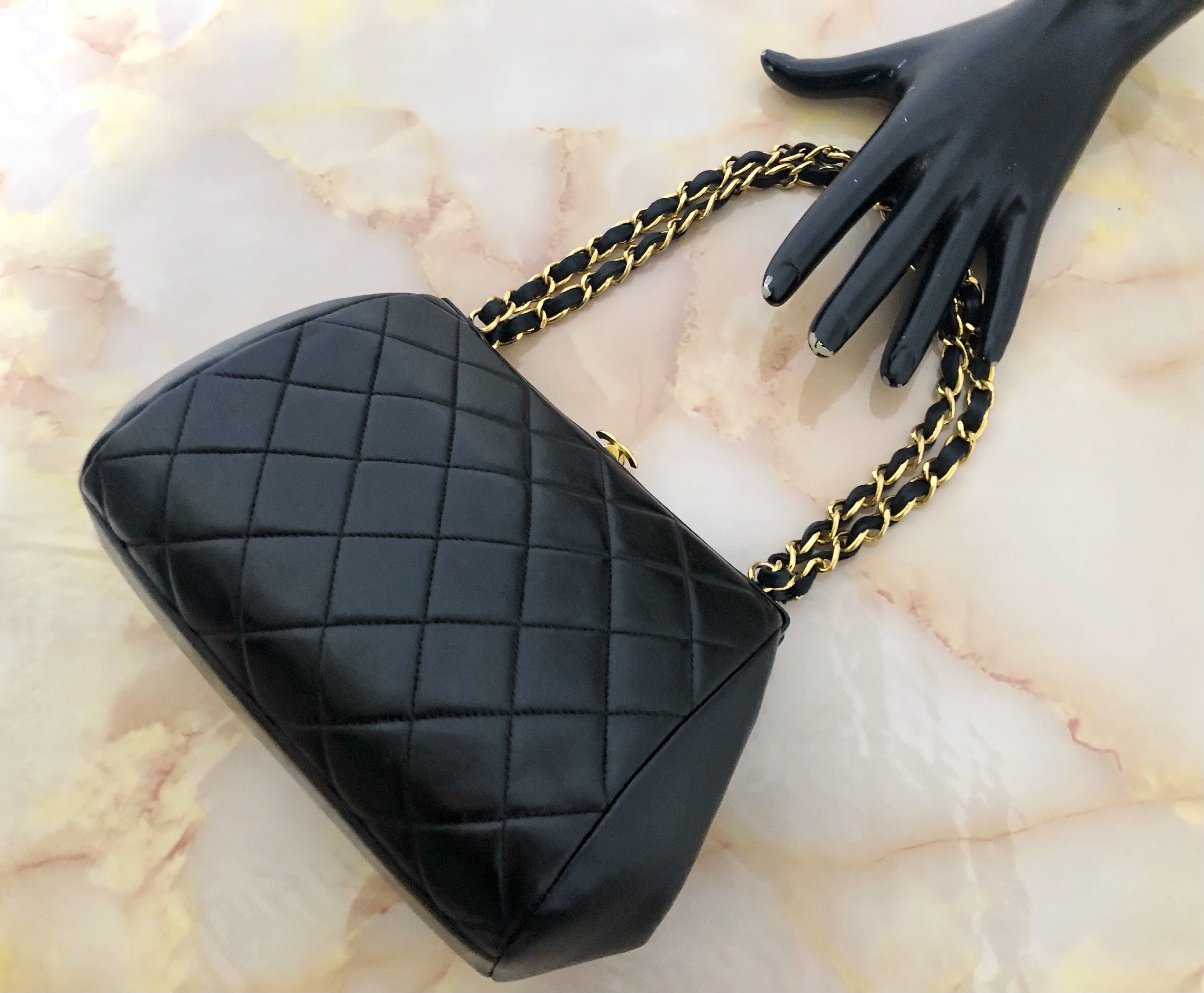 ドクターバッグのようにカッチリしたがま口タイプで、シンプルなキルティングステッチにCC金具の留め具がワンポイント入った上品なハンドバッグです。ハンドタイプのチェーンハンドというのも非常に珍しいですね。口が大きく開くので物の出し入れにも優れます。小ぶりなサイズなのでパーティーバッグとしてもお勧めです。滅多に出てこない本当に珍しいものですので、価値の分かる方にお譲り出来たら嬉しいです(^^♪