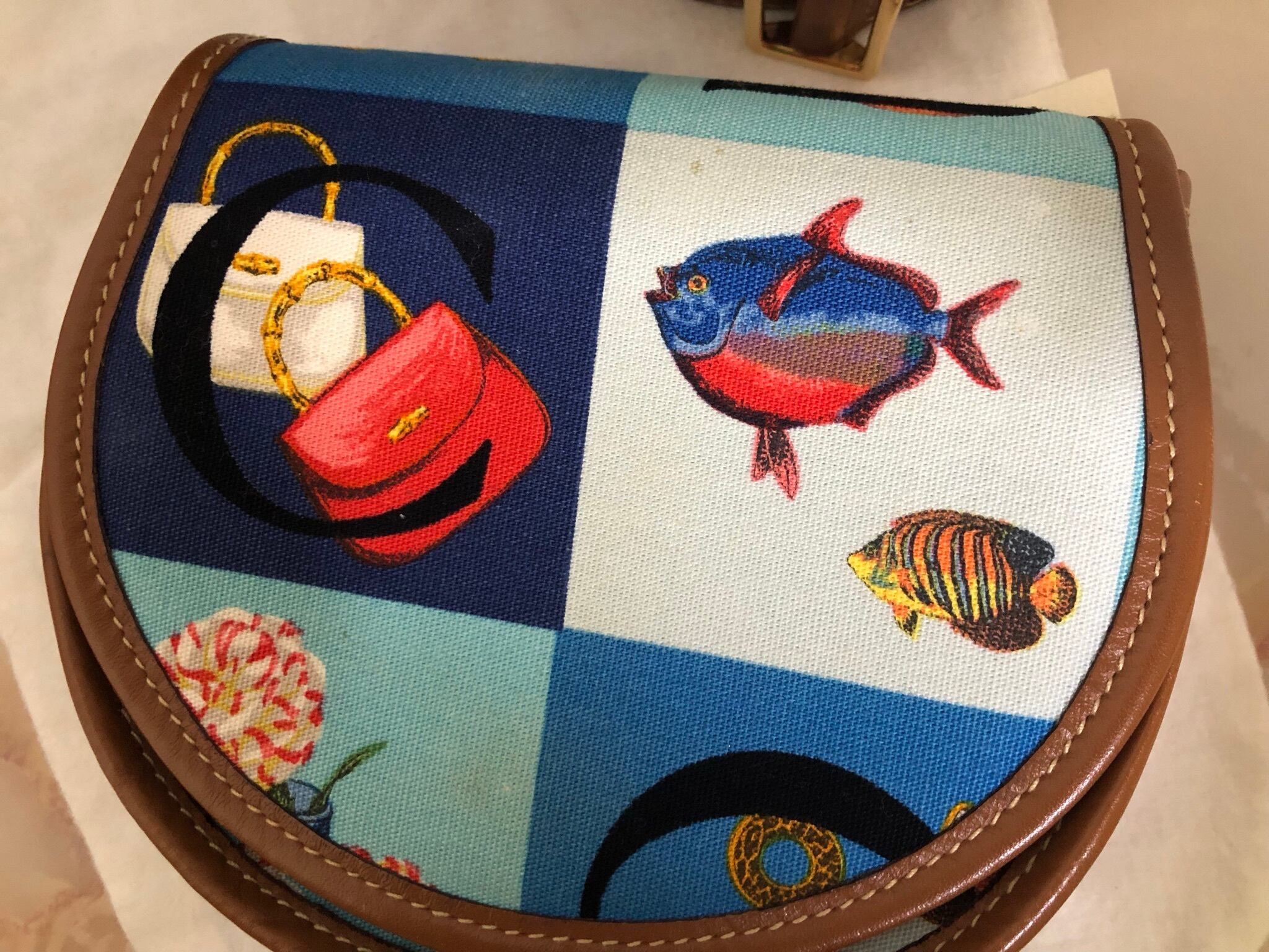 グッチの代名詞であるバンブーバッグやカラフルな熱帯魚などのアイコンがロゴとともにカラフルに描かれたハイセンスな品物です。専用のレザーベルト付ですぐにご使用いただけます。