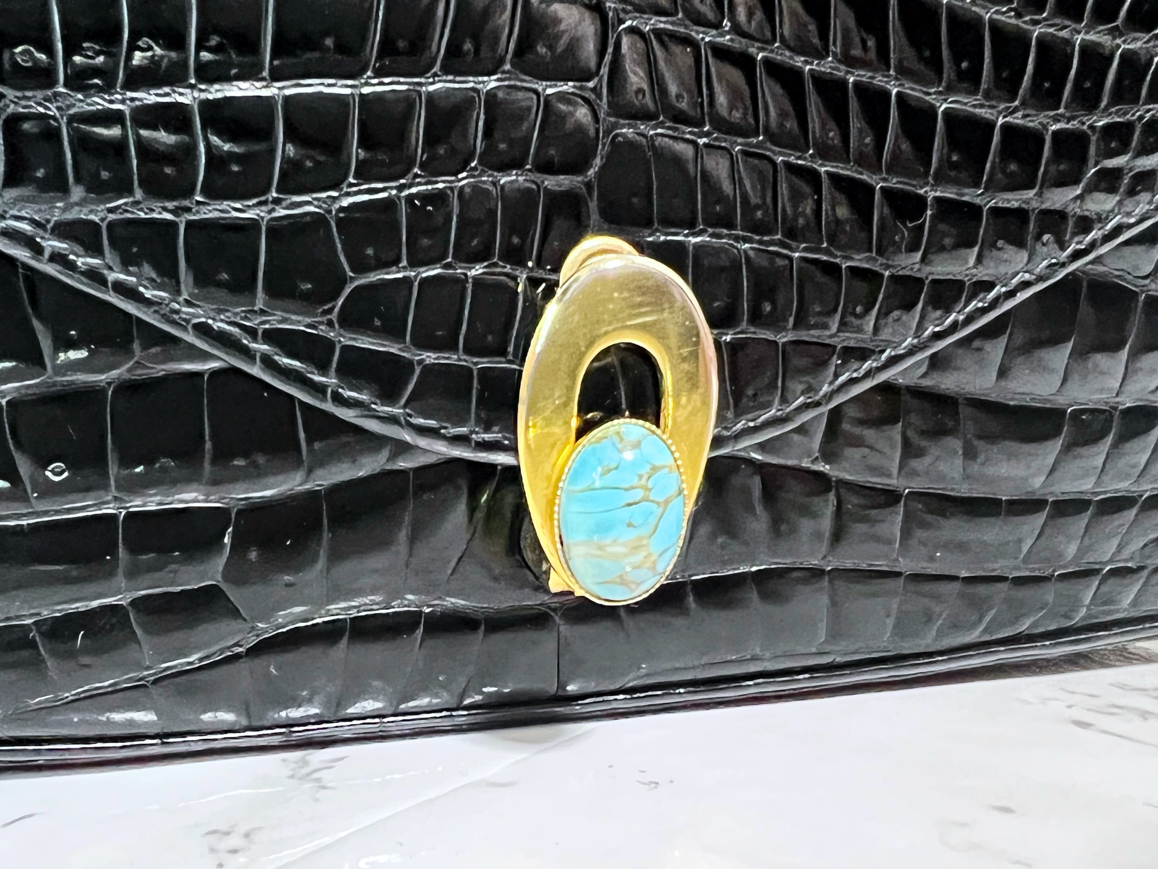 見る人が見れば腑の大きい現行モデルのアリゲーター等と比べ、どちらが素材的な価値は上かは一目瞭然です。また中央の留め具にターコイズを1石使用しているのもオールドグッチの中でもかなり珍しい型です。ブラックのクロコにターコイズブルーが何とも雰囲気を感じますね(^^