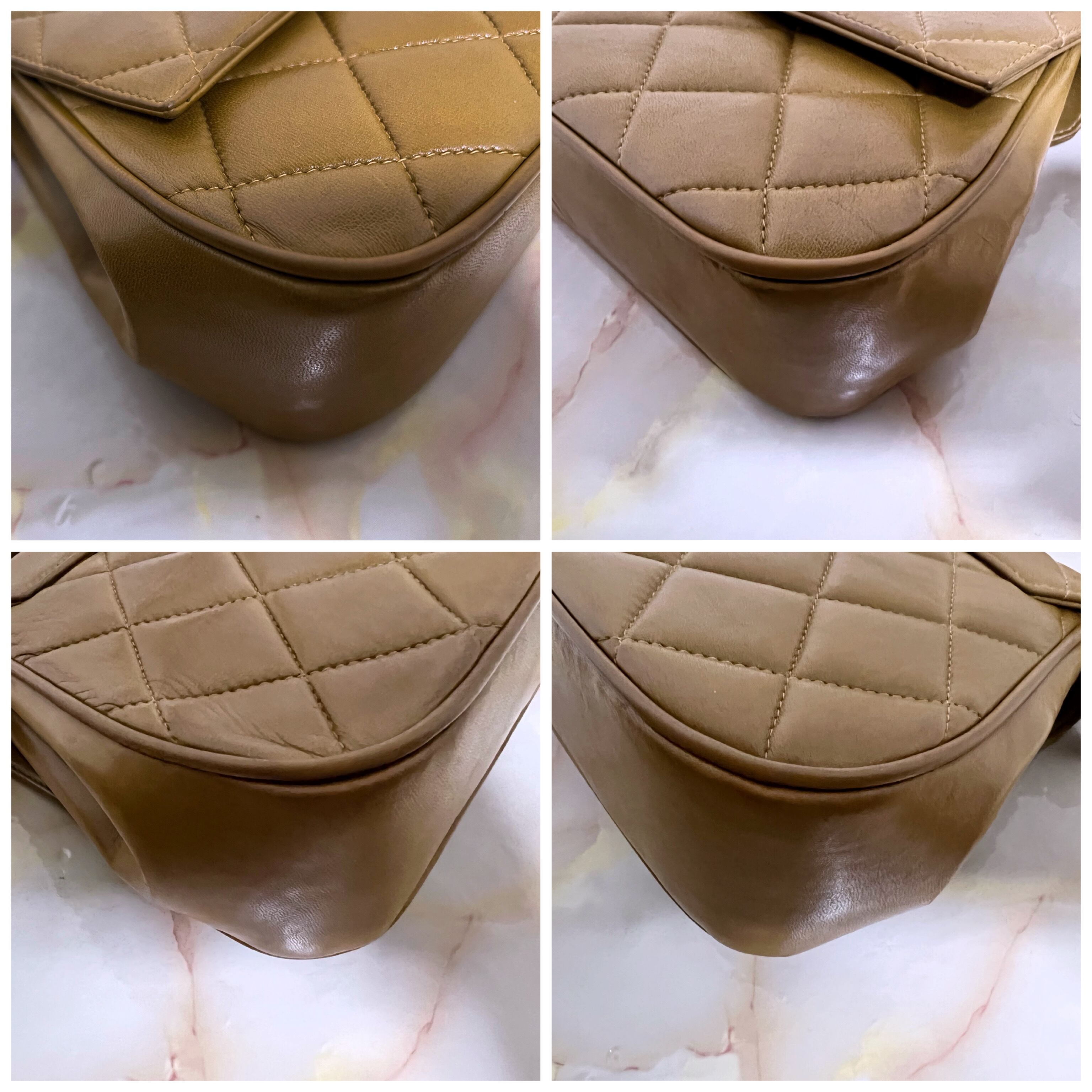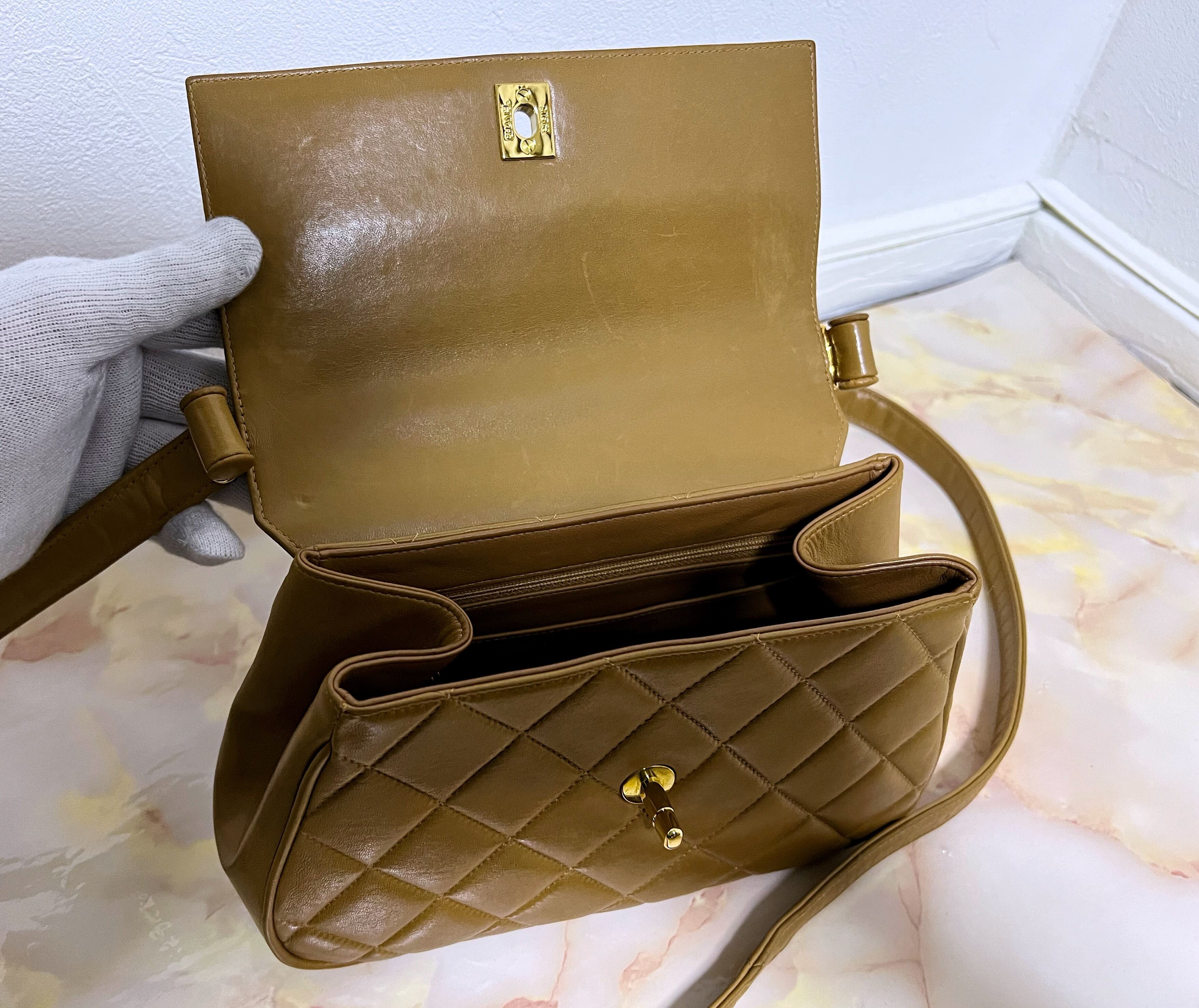 非常に珍しいオリジナルのキャメルカラーが綺麗に残ったヴィンテージ シャネルのターンロック式レザーショルダー。ネット上でも見かけることが少ない非常に珍しい型です。カッチリとした品のあるデザインながらレザーショルダーの実用性も兼ねそろえた使い勝手の良いバッグです。(※内面の色、ステッチも本体と同色。レザーの質感や不自然な色むら等もないことから自信を持ってオリジナル物と判断していますが、オリジナルに神経質な方やご不安な方はお控えいただくようお願いします。)