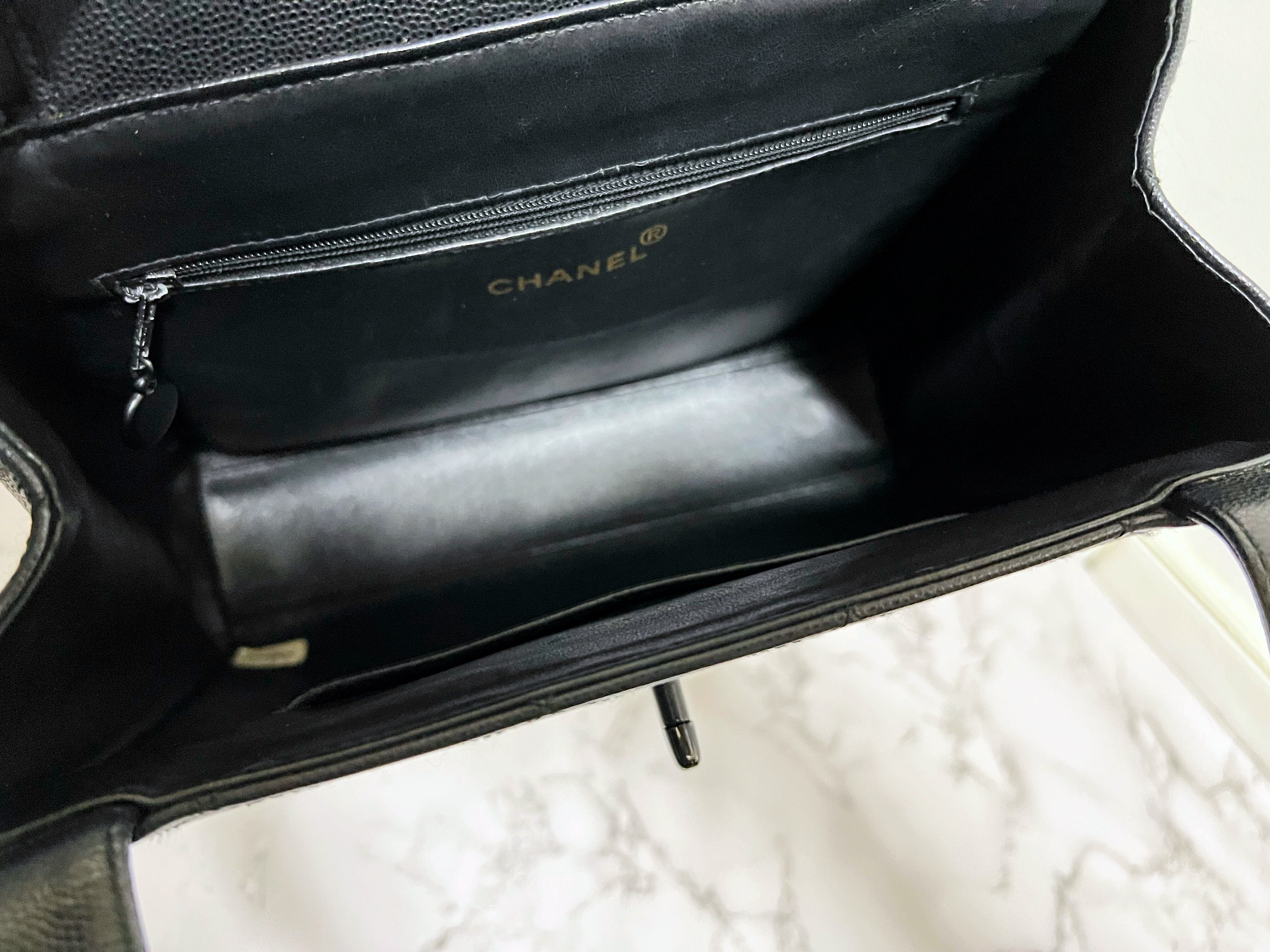 1998年のヴィンテージ シャネルです。正面のCC金具は勿論のこと、内部のファスナー、チャーム、表面キャビアスキン、内部ラムスキンなど全ての部分をブラックで統一したヴィンテージ シャネルらしい拘りを感じる逸品です。