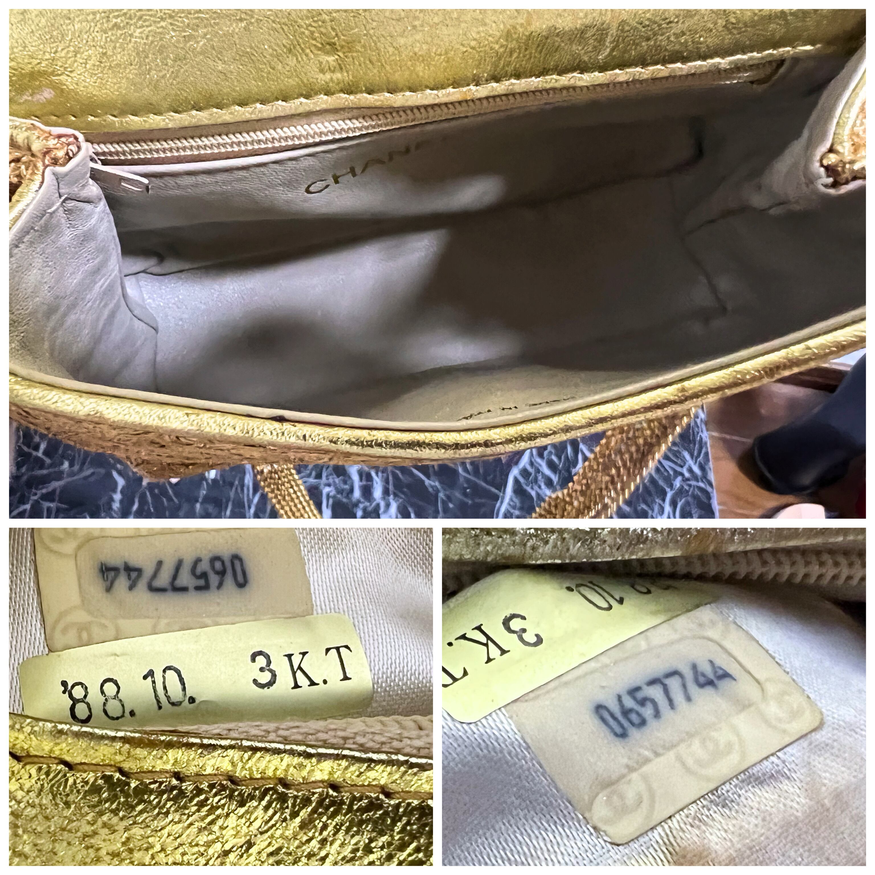 6連チェーンにはラインストーンが随所にあしらわれ、金具や縁、表面層レース柄等全てゴールドカラーで仕上げた豪華な造りです。まさに古き良き時代の生み出した逸品といえます。底面にCCマークがありますが、パッと見ではシャネルと気づかれないデザインがシャネルコレクター上級者には堪らないお品物だと思います(^^♪