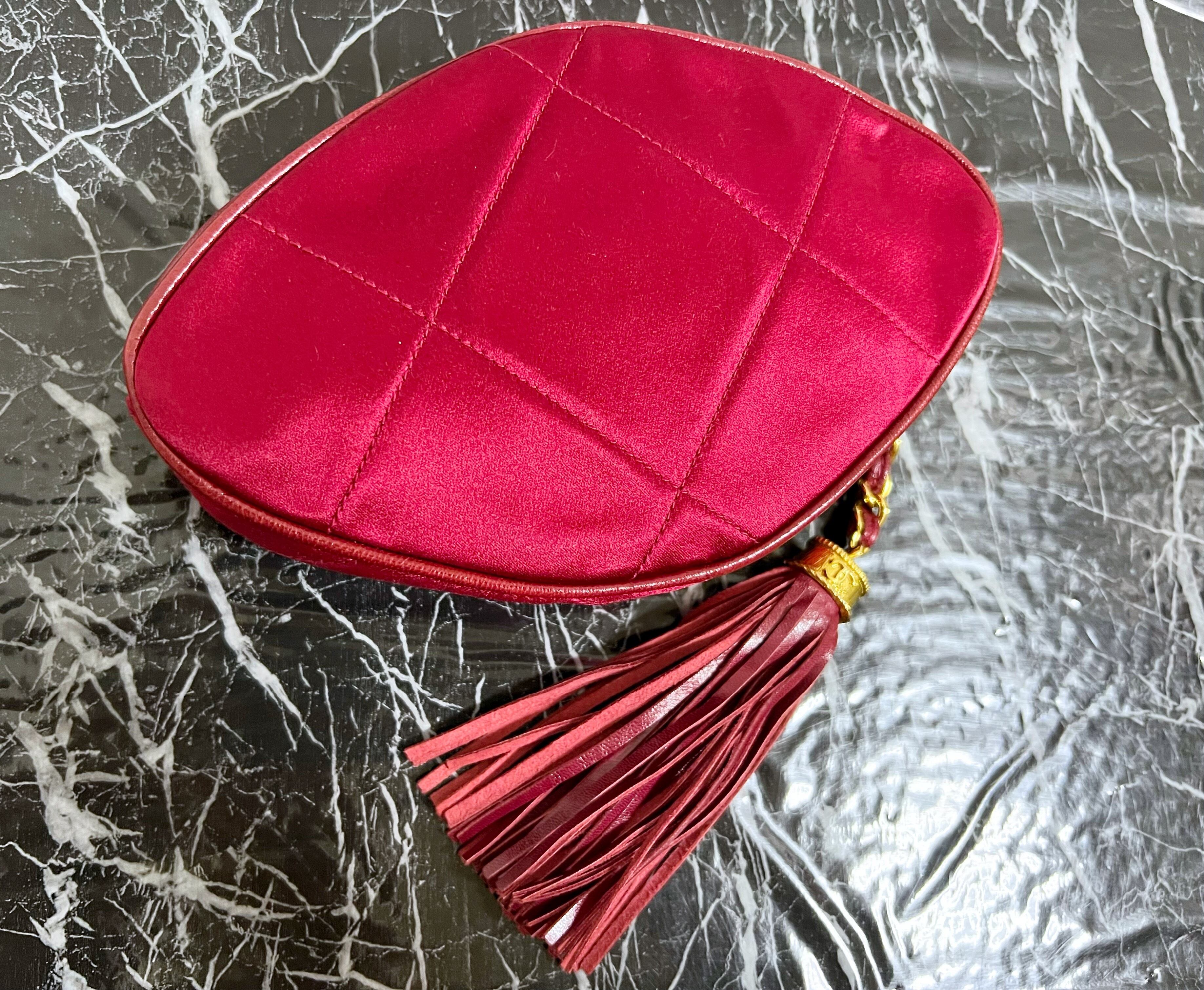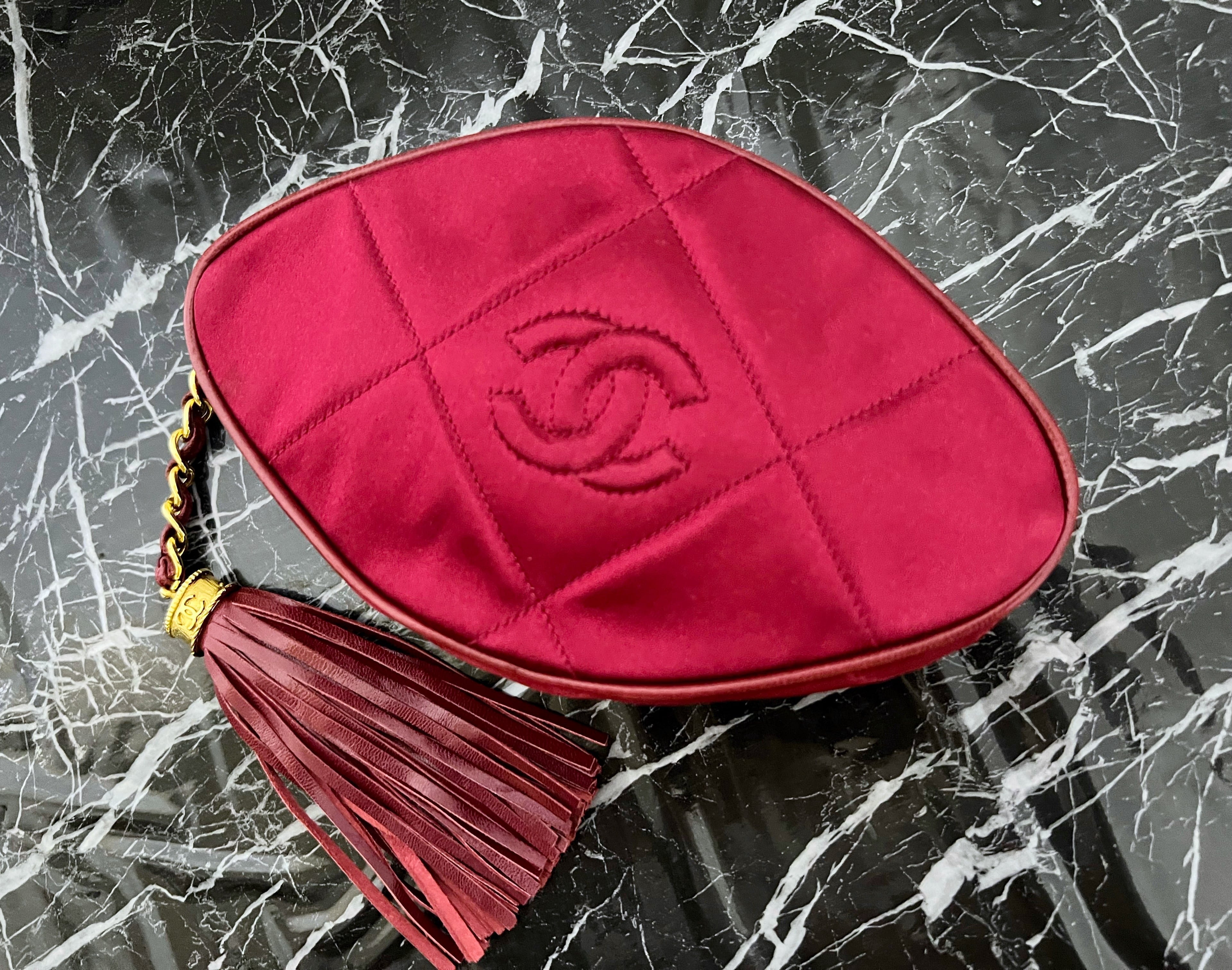 現行モデルにはまずない趣のある菱形形状に加え、タッセルチャーム、シルクサテン素材にルージュカラー、全ての組み合わせがうまくまとまった素晴らしい逸品です。サテン独特の艶感のある光沢で落ち着いた大人のルージュカラーが何とも魅惑的なオーラを放っています。使用感らしい使用感が無く初めてヴィンテージの年代を買う方にも安心してお勧めできます。