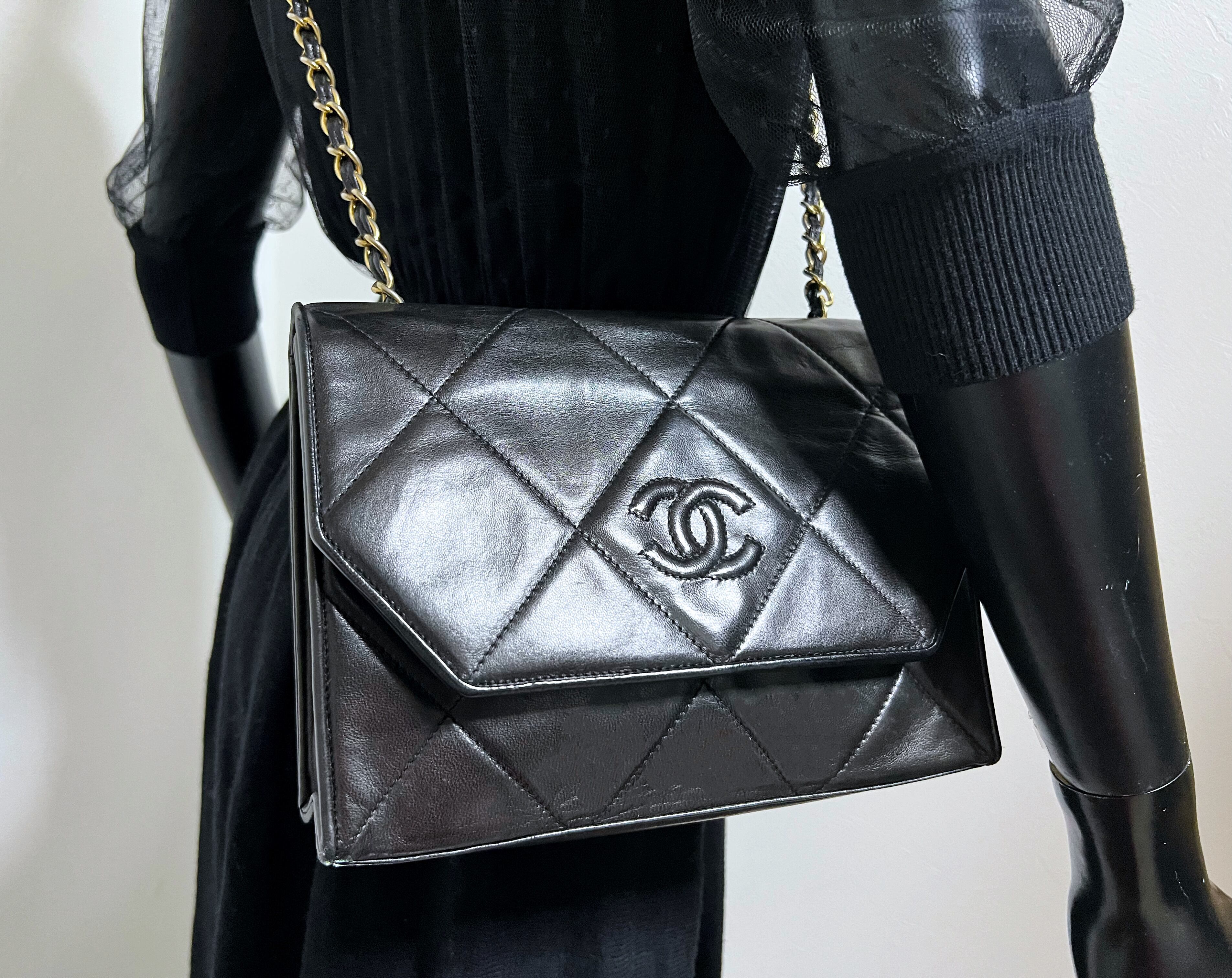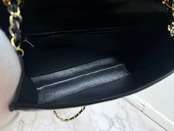 現在シャネルでリバイバル販売されているビッグダイヤステッチのオリジナルとなった希少なモデルです。現行モデルにはないレトロなフラップの形状にヴィンテージの趣を感じますね(^^ 長財布やスマホなど一通り必要なものを適度に収納できるサイズ感も重宝いただけると思います。 素材はラムスキン、カラーはブラックになります。