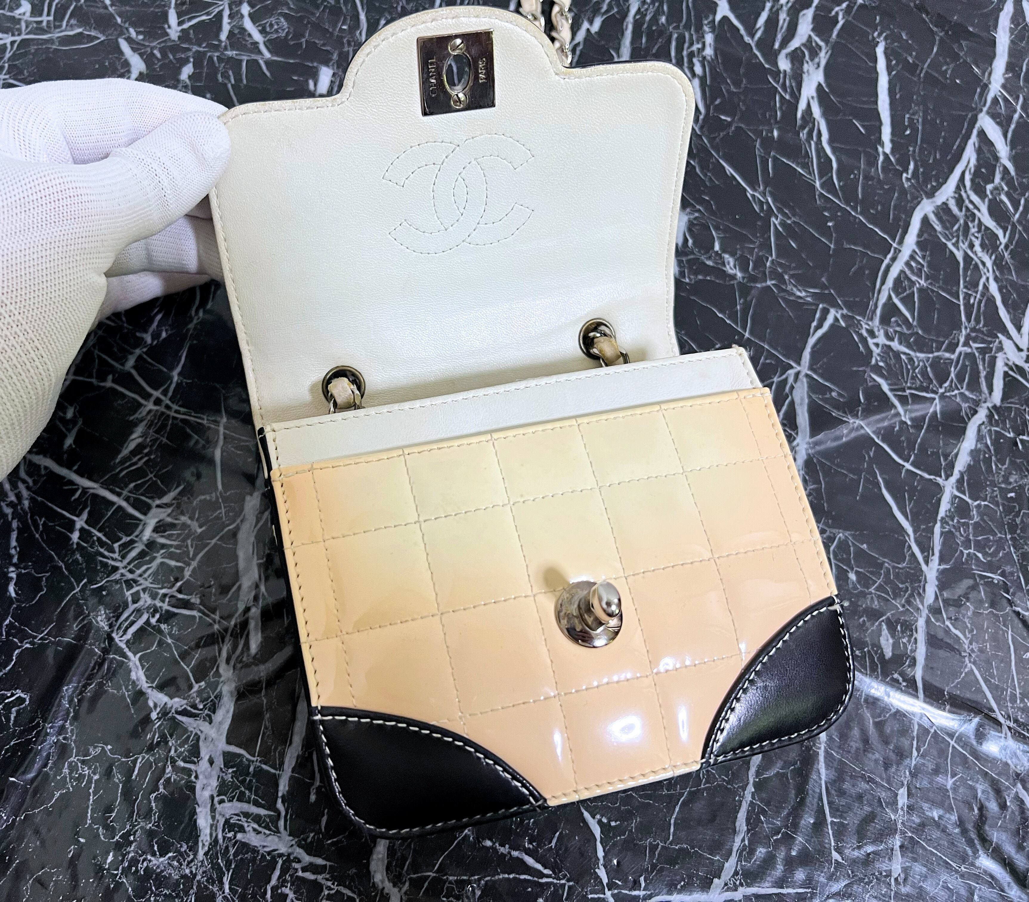 手のひらにギリギリ収まるミニマム感とバイカラーの組み合わせが最高にクールな逸品です。ブラックの縁取りや側面、底面、ショルダー部分はレザー素材、チョコバー部分のみエナメル素材になっています。ブラックレザー部分はホワイトステッチにしているところもシャネルの細部への拘りを感じさせます。全体的な状態も非常に良く20年近く昔の物とは思えない良好なコンディションです。(エナメルのベタツキ等も一切ありません。)
