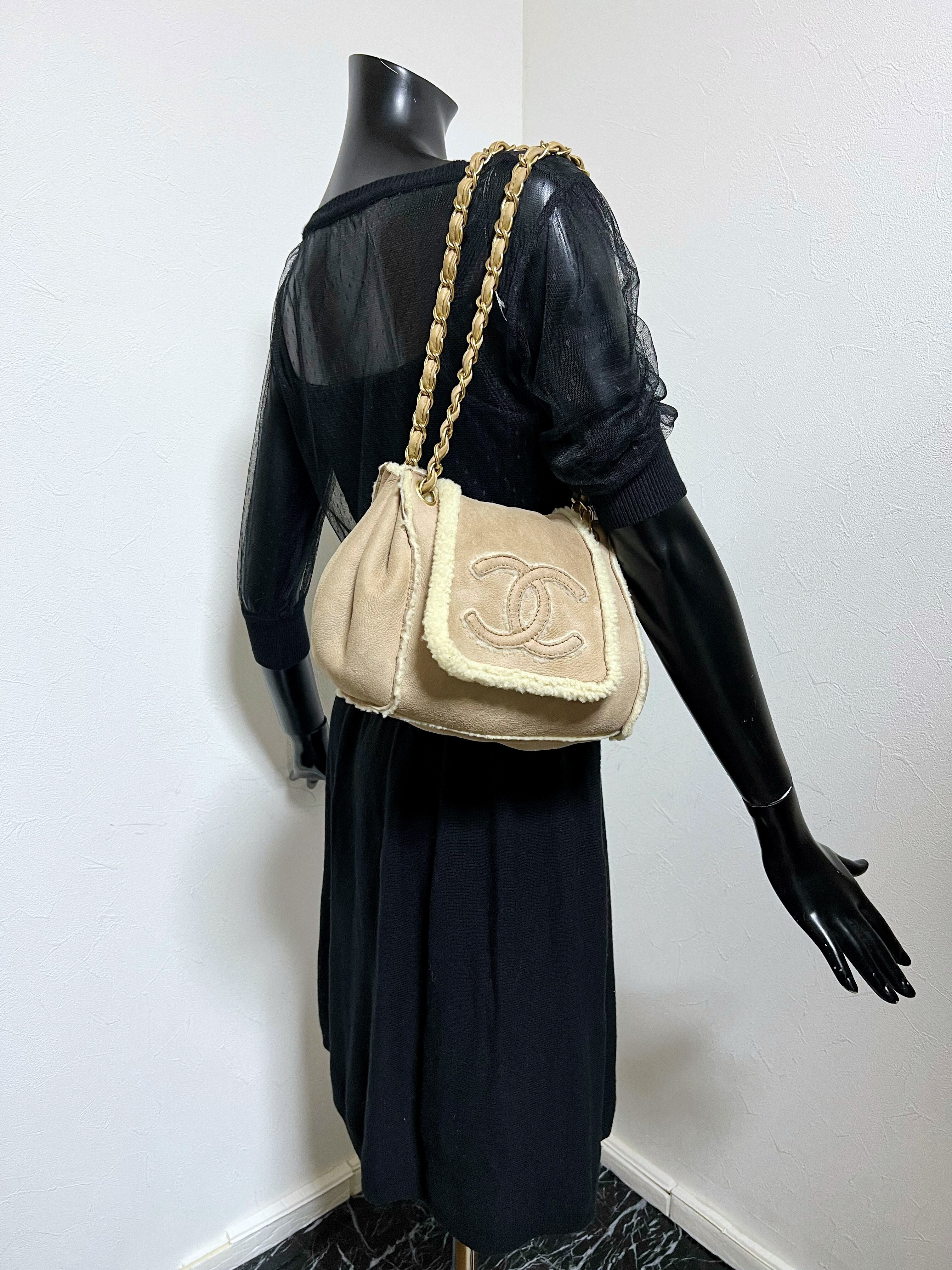 2001年のネオクラシックの年代とは思えない可愛らしいムートン素材のチェーンショルダーです。裏地や縫い合わせのボアがシャレてますね。ダブルチェーンなので肩掛けと斜め掛けの二通りの使い方を楽しめます。秋冬シーズンに持ってこいの素晴らしい逸品です。