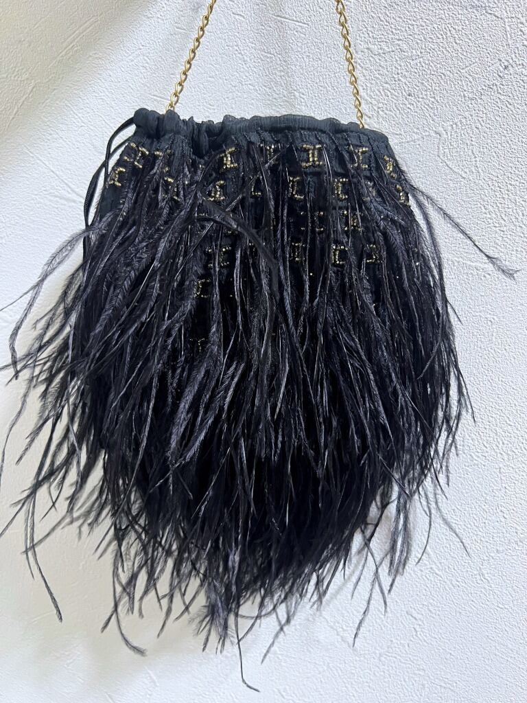 レア 新品同様品 シャネル リアルオーストリッチフェザーファー×ビーズ 巾着チェーンショルダー